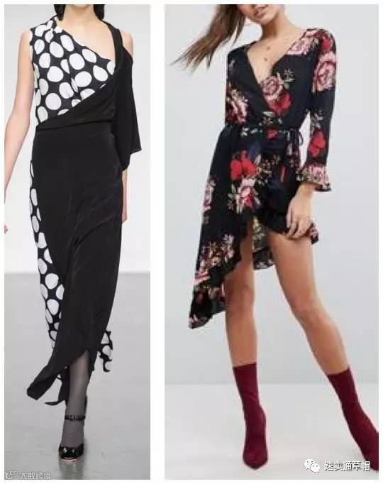 通过斜角剪裁打造不对称轮廓,结合印花拼贴增强视觉层次感,突出女性身形美感[k]。