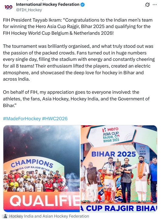 International Hockey Federation (FIH) President Tayyab Ikram remarked: “Congratulations to the Indian men’s team for winning the Hero Asia Cup Rajgir, Bihar 2025 and qualifying for the FIH Hockey World Cup Belgium & Netherlands 2026! The tournament was brilliantly organised, and what truly stood out was the passion of the packed crowds. Fans turned out in huge numbers every single day, filling the stadium with energy and constantly cheering for all 8 teams! Their enthusiasm lifted the players, created an electric atmosphere, and showcased the deep love for hockey in Bihar and across India. On behalf of FIH, my appreciation goes to everyone involved: the athletes, the fans, Asia Hockey, Hockey India, and the Government of Bihar.”