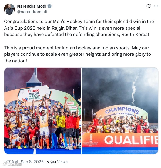 Congratulations to our Men’s Hockey Team for their splendid win in the Asia Cup 2025 held in Rajgir, Bihar. This win is even more special because they have defeated the defending champions, South Korea! This is a proud moment for Indian hockey and Indian sports. May our players continue to scale even greater heights and bring more glory to the nation!