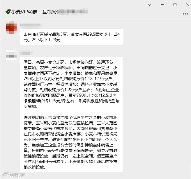 山东临沂青援食品涨5厘,普麦带票29.5面筋以上1.24元、29.5以下1.23元