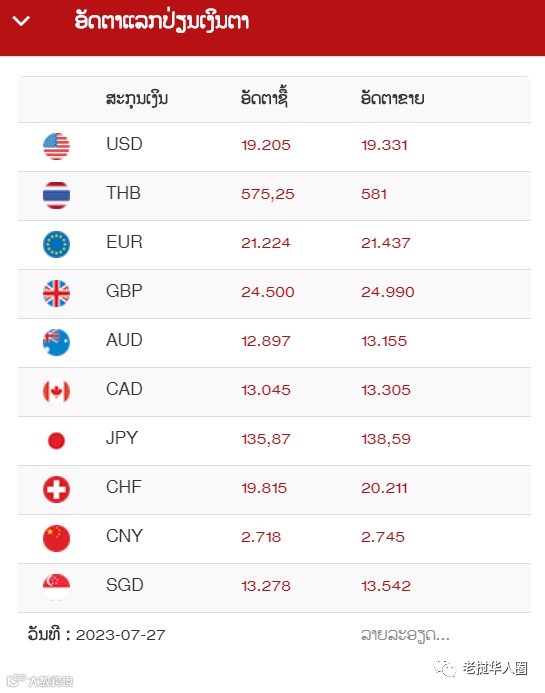 7月27日,老挝外贸银行更新老挝基普兑换汇率公示如下: