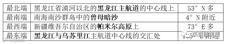 注:南北跨纬度大,温差大(气候差异大);东西跨经度广,时差大。