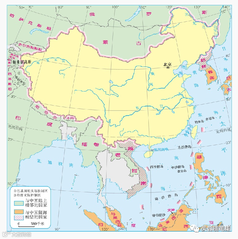 (2)纬度位置约在4°N-53°N之间,大部分位于北温带,南部部分位于热带,没有寒带。