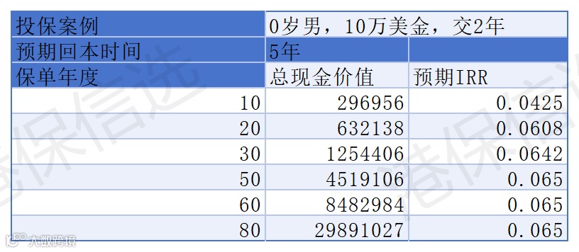 收益实测(0 岁男,年缴 10 万美金,缴 2 年):
