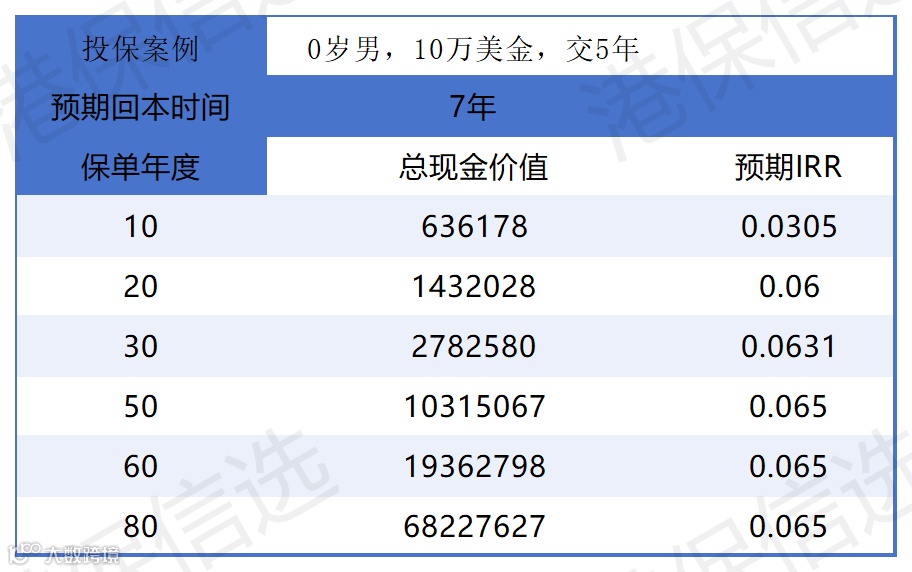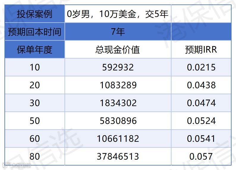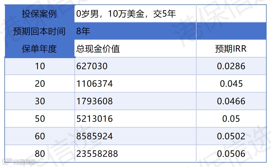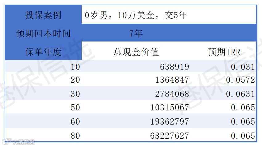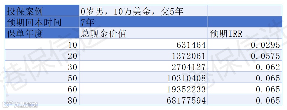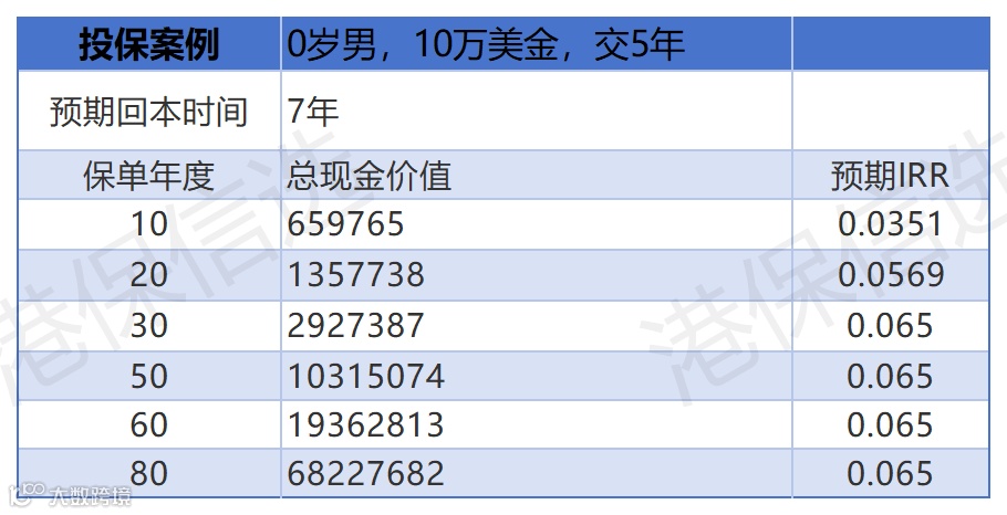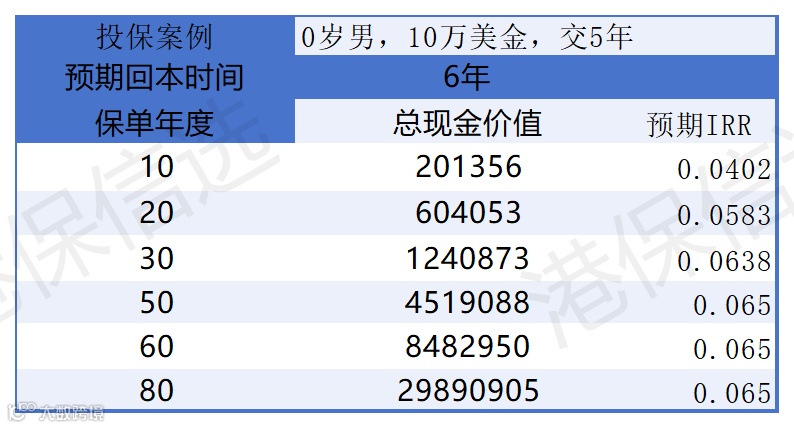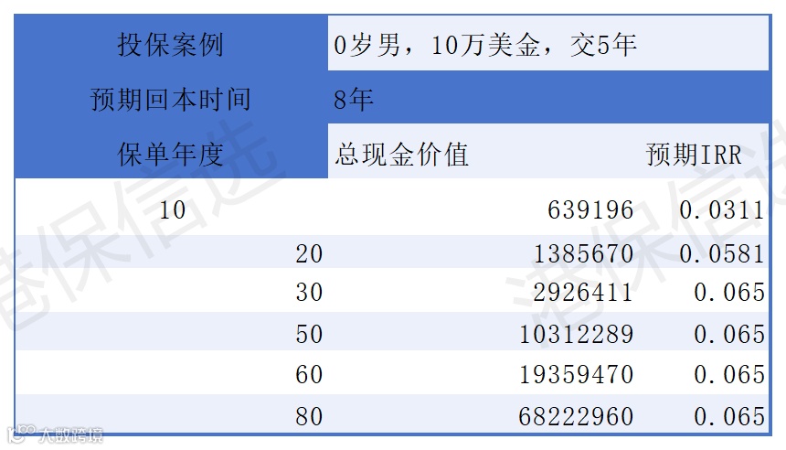 收益实测(0 岁男,年缴 10 万美金,缴 5 年):