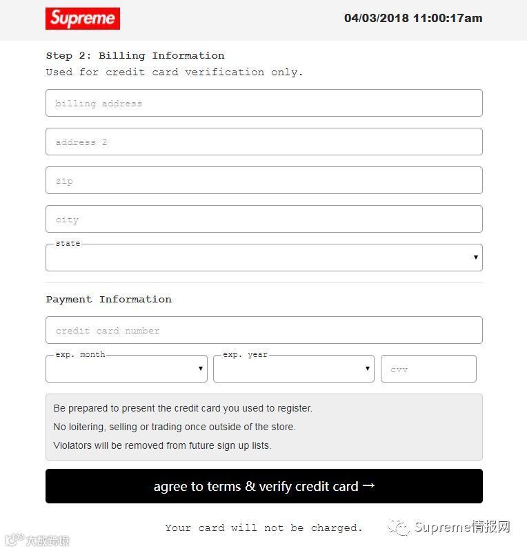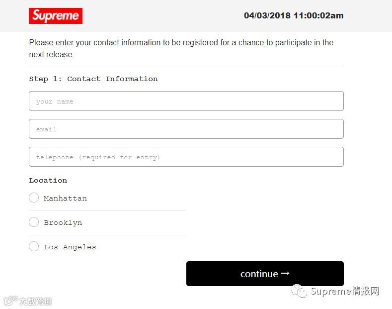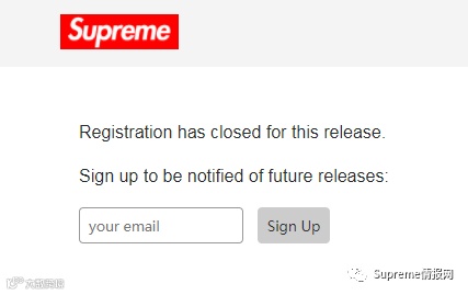 想要申请排队资格,需要在每周二上午11点(纽约时间),LA为早上8点、北京时间为晚上11点,去到Supreme的预约专门页面注册申请,地址:https://register.supremenewyork.com,跟发售一样整点准时刷新页面即可,日常此页面是关闭状态,