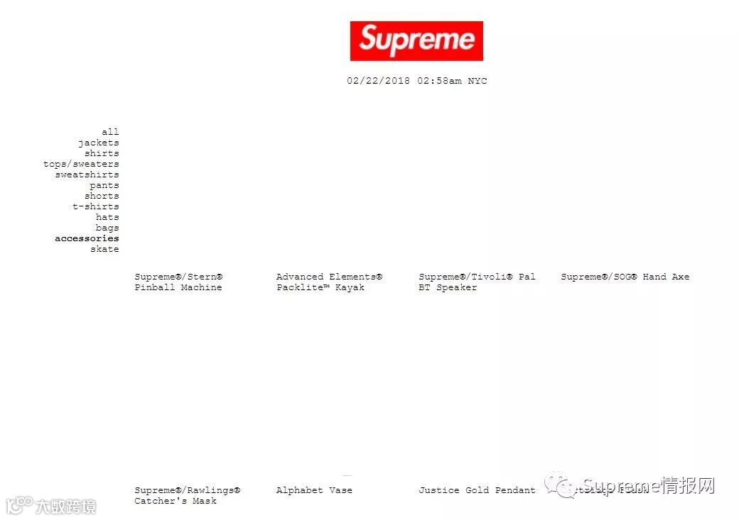 1、官网当整点开始发售的时候,请不要刷新商店首页的URL链接,而是针对性选择目标,如果你就要抢配件,那么就锁定配件的URL:http://www.supremenewyork.com/shop/all/accessories,以此类推,更改最后一个分类名称单词即可。