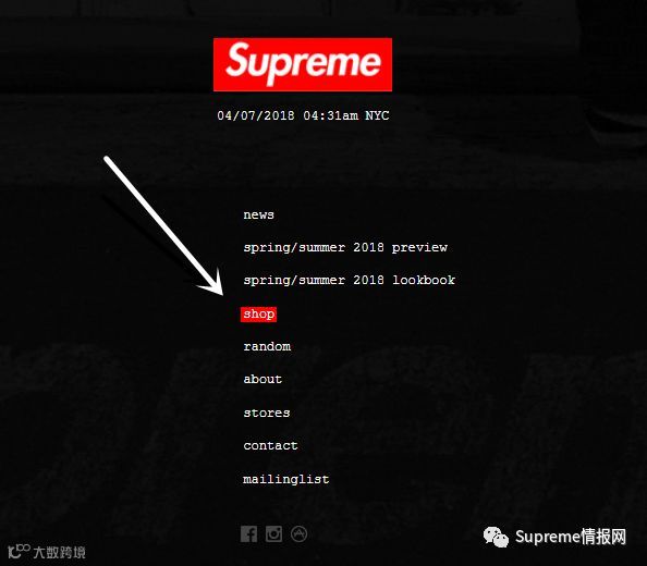 点击上图白色箭头所指的第四行“Shop”,即可进入商城。Supreme在美国、英国、法国、日本,4个国家设有实体店铺,也分别设有不同的商城,但共享同一个网址,当大家处在不同的地区,进入Shop商城的时候,它会按照自有规则把你分配到指定的国家,怎么分辨呢?点击进入Shop商城后,如下图,