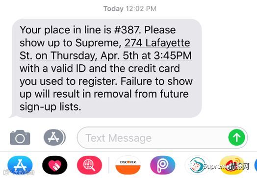 Ssupreme现在的保安是要求不能来早也不能来晚。如果提前五分钟以上,会被禁止在保安视野范围内徘徊。如果准点排队,看保安当天的智商跟心情,很可能不按照短信给的位置而是按照排队者到达的顺序进行排队。