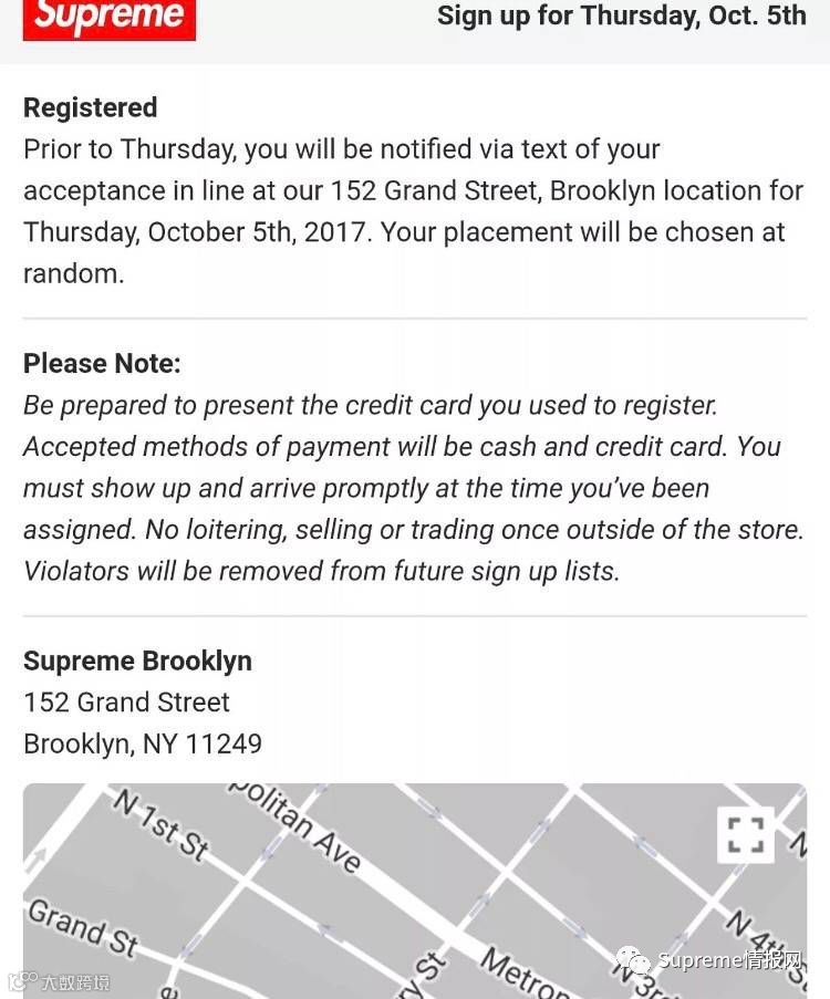 直到出现一个地图界面,那么恭喜你,你成功进入了Supreme入店申请摇奖池。紧接着是漫长的两小时等待,Supreme会在下午1点发出第1批短信,请回复Yes或者No(截止时间4点),然后下午四点会放最后一批(就是第一批回复No的玩家空出来的名额,截止时间7点)。