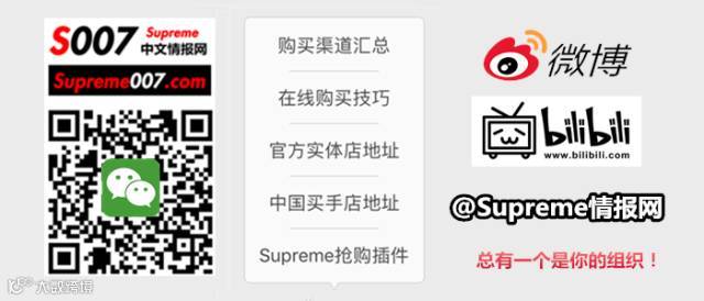 想去Supreme官网抢购?想看更及时的情报信息?长按识别下方二维码关注我们,更多的攻略等你发现!还有免费抢购插件送给你哟!