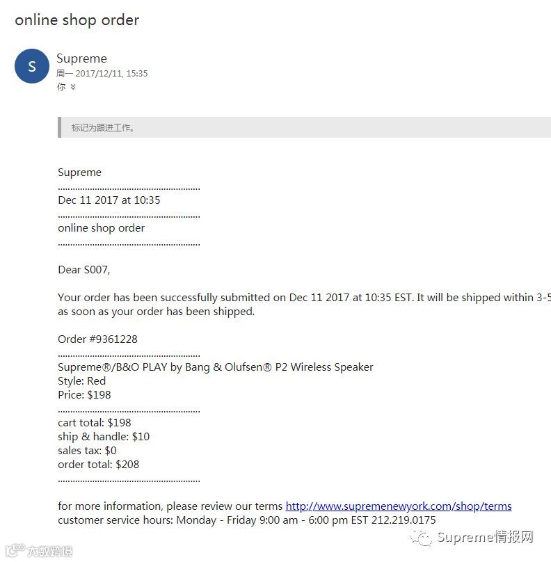 4、Supreme正确无意外的购物流程是:下单结账 -- 收到订单邮件 -- 收到发货邮件(里面会有发货单号) -- 收货,砍单时常发生,但是极个别的“幸运儿”,也可能是卖超了等等原因。