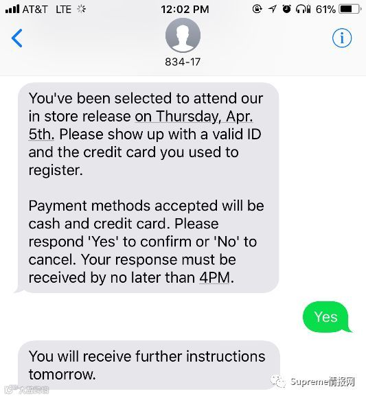 如果你没有收到,那么对不起兄弟,你凉了。第二天,也就是周三中午12点左右,回复Yes的人会收到一个随机号码短信,有时间地点,照着时间地点排队就好啦,记得带好本人ID和注册所用信用卡,排队之前会查验。