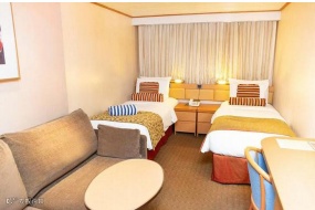 舱房设施:内舱房、海景房都配备两张单人床(可拼成双人床)、衣橱、淋浴、电视、电话、迷你吧、保险箱、空调,海景房还能透过窗户看海上风光,早上被阳光和海浪声叫醒,幸福感拉满。