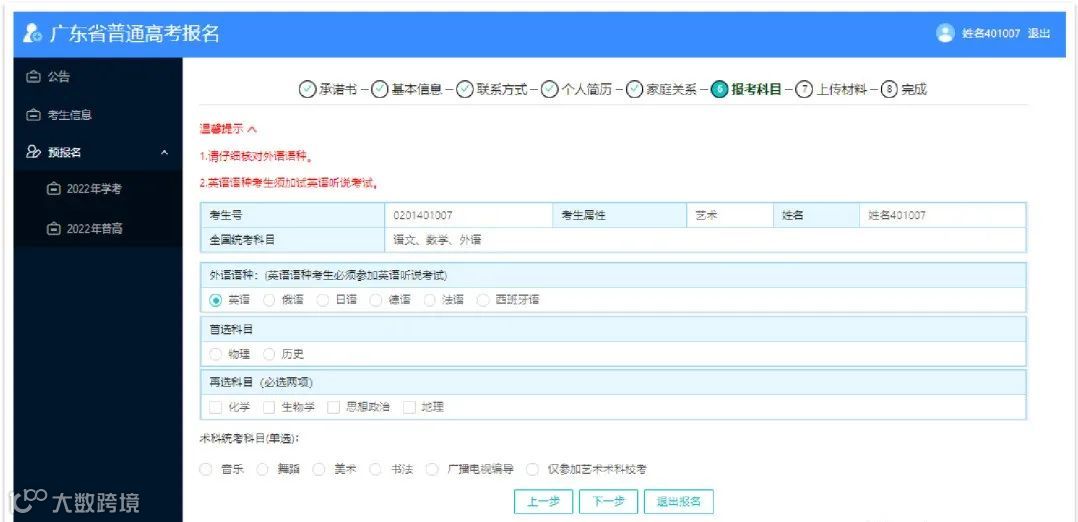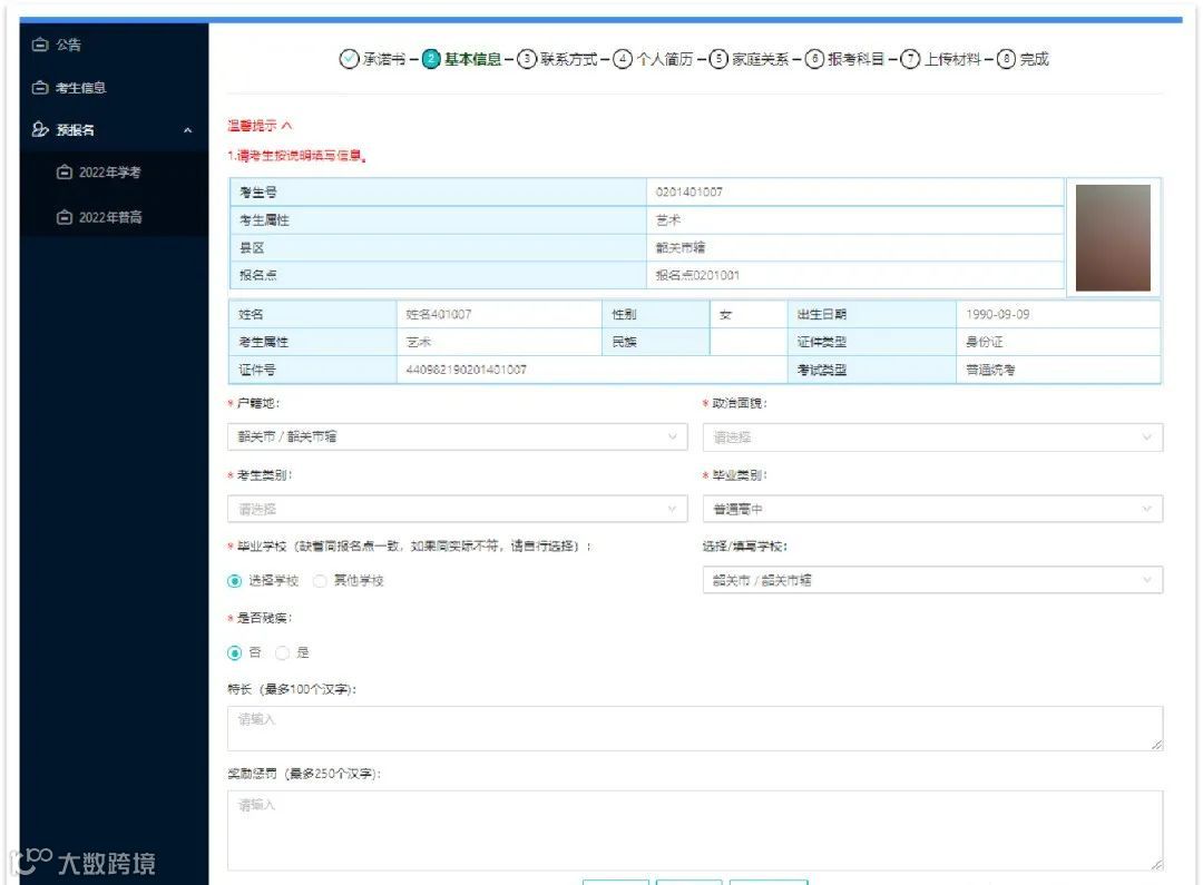 流程:①签订《考生诚信考试承诺书》→②基本信息→③联系方式→④个人简历→⑤家庭关系→⑥报考科目→⑦上传材料→⑧完成