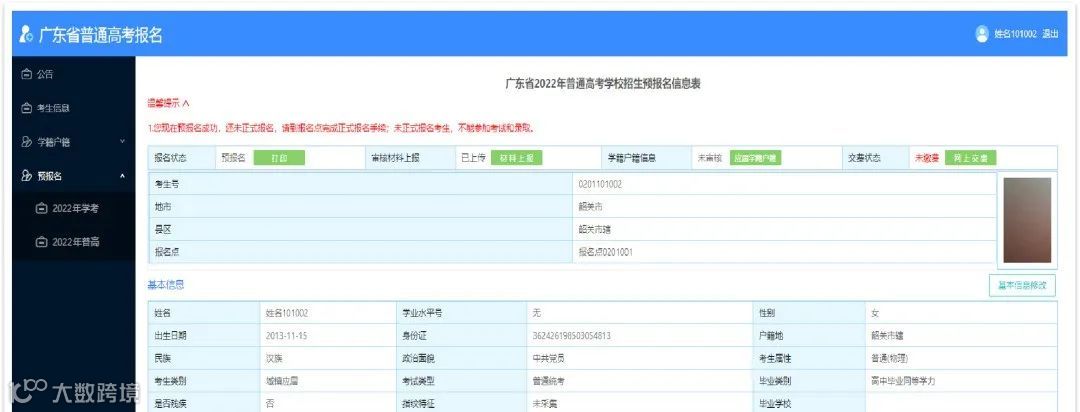 考生完成注册后,页面会显示【请携带相关资料到报名点领取考号】,前往报名点进行资料审核和领考生号,领了考生号才能进行预报名。注意!在校生学校会派发(在校生),社会考生需要自己去招考办现场提交资料领取。