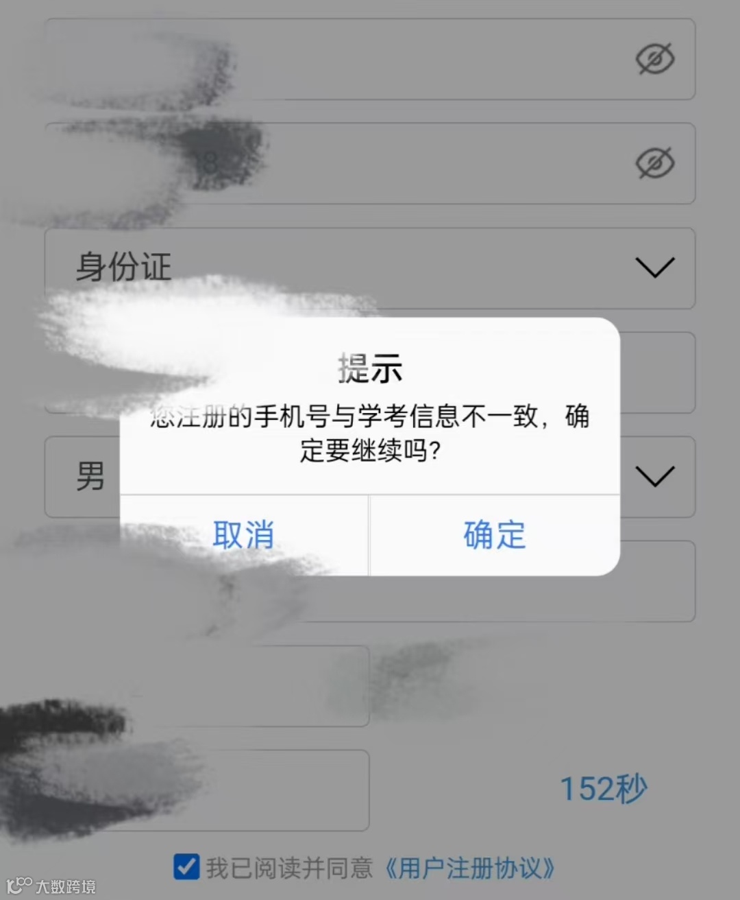 如果出现提示注册手机与学考信息不一致是没关系的,点击“确定继续”即可。