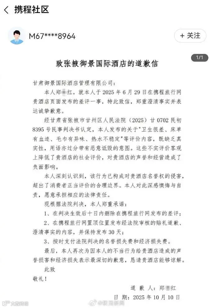 2025 年 10 月,法院作出(2025)甘 0702 民初 8395 号民事判决,要求郑某红在判决生效后十日内完成三项义务:一是删除在携程旅行网发布的涉案差评;二是在携程旅行网置顶位置发布经法院审核的赔礼道歉及事实澄清内容,并保持 30 天;三是向酒店支付名誉损失费与经济损失费共计 3.5 万元。