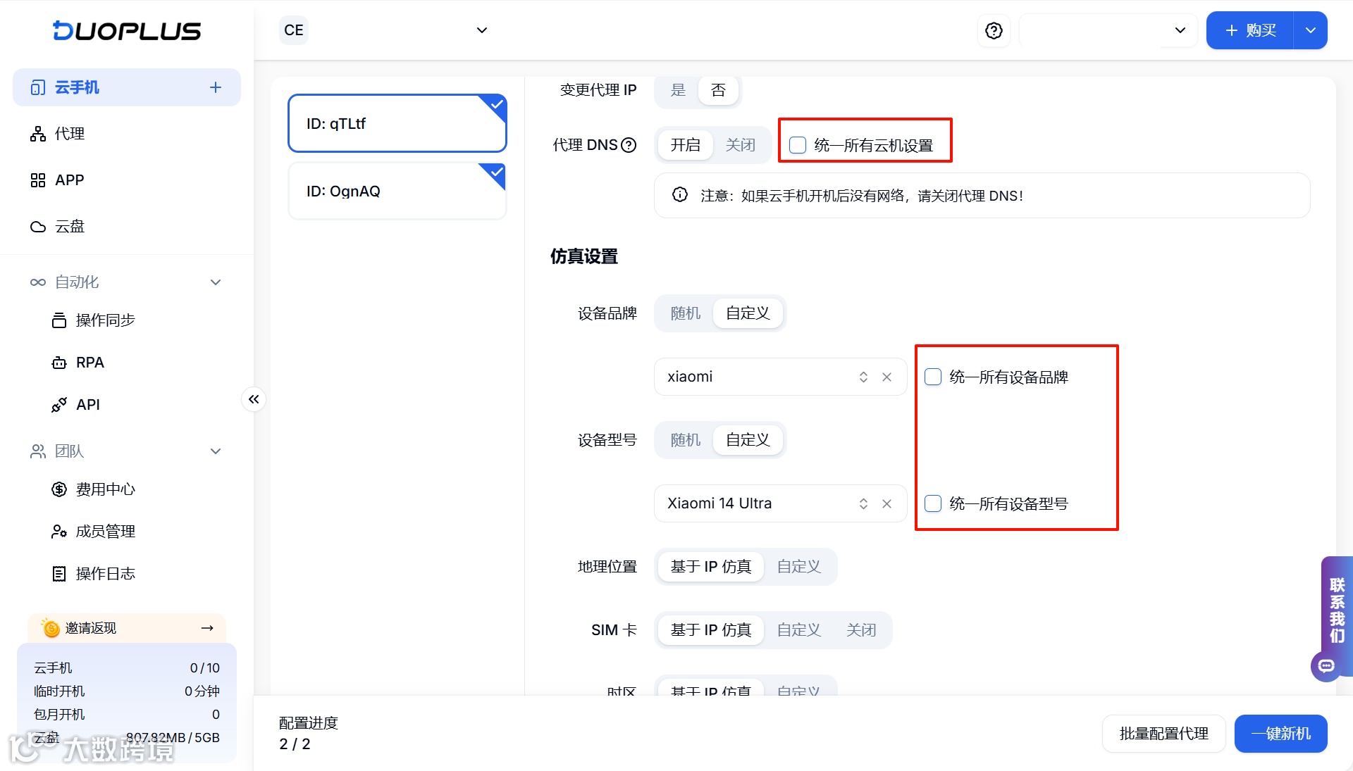 你也可以对多台云手机执行批量一键新机的操作,包括统一多台设备的品牌型号