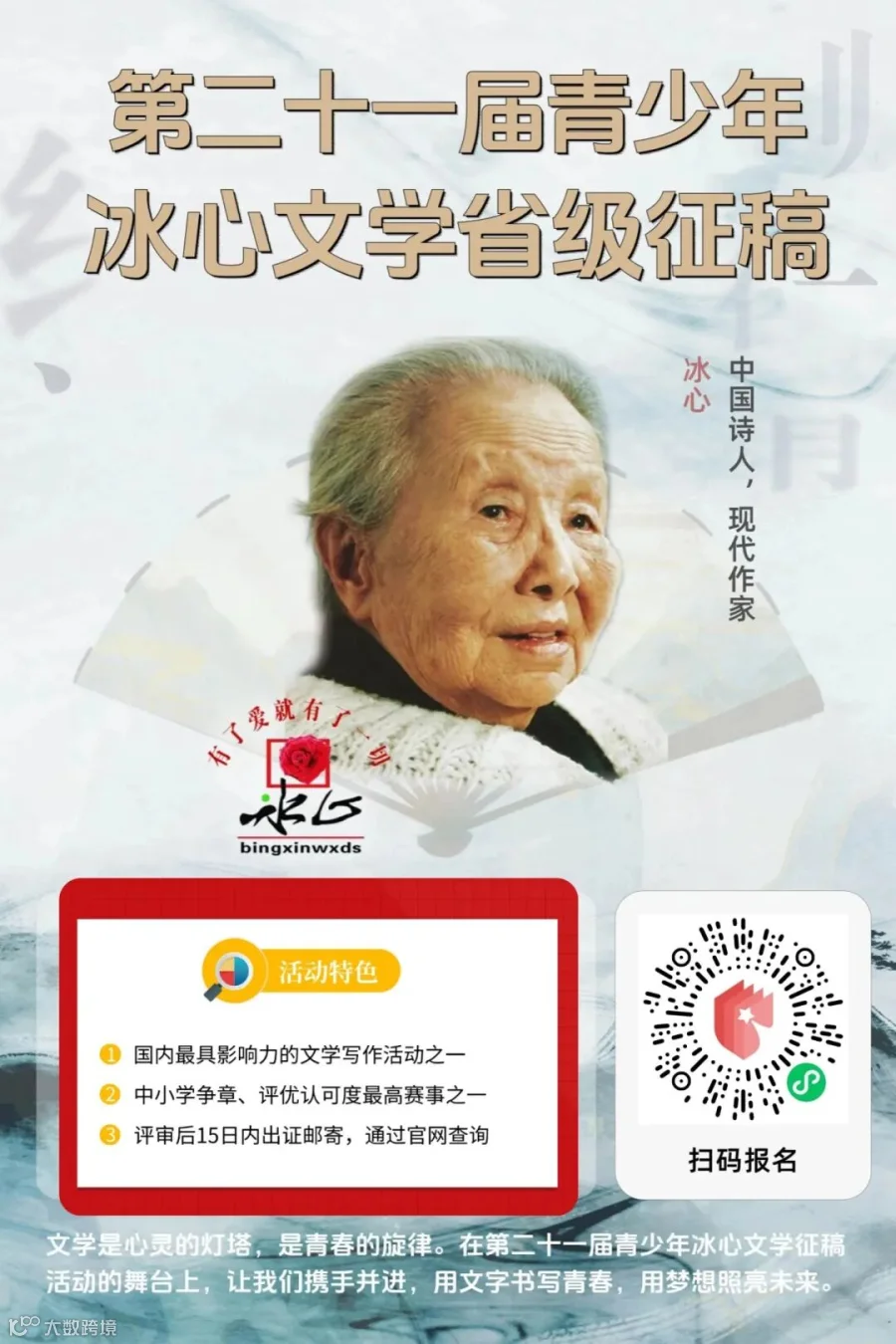 冰心是中国现当代文学史上最具爱心和最具影响力的作家之一,她一生追求光明、奉献爱心、启迪后人 “冰心文学征稿活动”是国内最具影响力的文学写作活动之一。更是双减后的文学写作的行业标杆,中小学首选文学写作活动赛事!每届参赛稿件高达几十万份,覆盖了全国所有省份及地区。