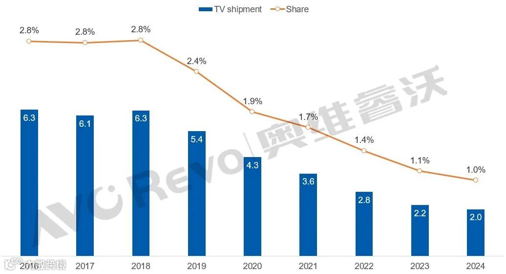数据显示,松下电视在全球的出货量从2016年的631万台下降到2024年的202万台,全球市占率仅剩下1%。即使在日本本土,松下电视的市场份额也从2018年的16.8%下降到2024年的8.8%,排名第六。