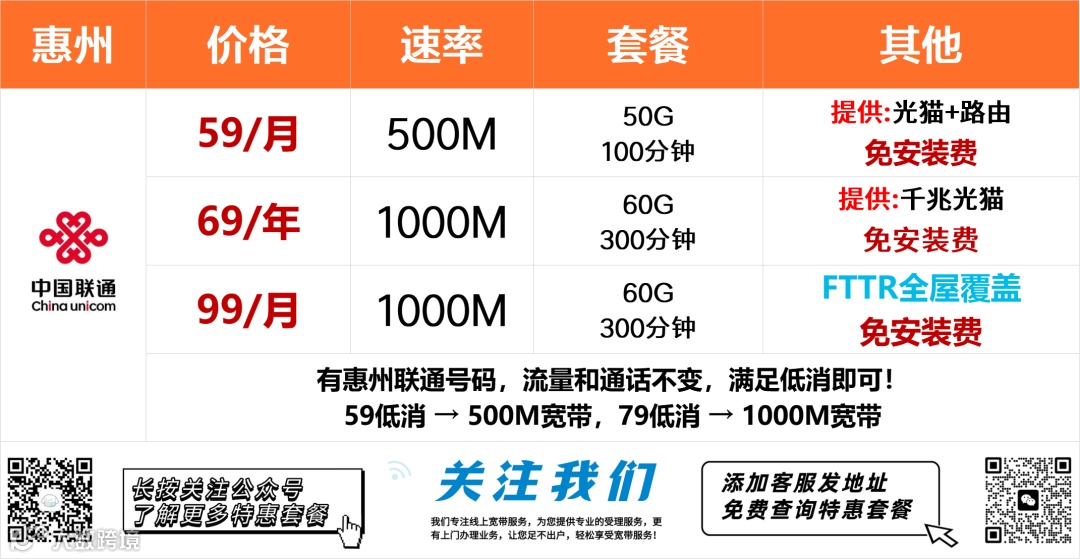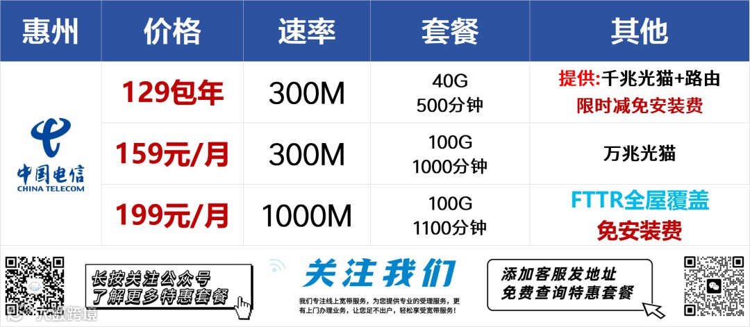 99/月长期优惠 → 1000M宽带、60G流量+300分钟通话+FTTR光纤组网WIFI覆盖+机顶盒(适合家里房子大面积的朋友们哦)WiFi信号覆盖在那个角落都可以连接哈!