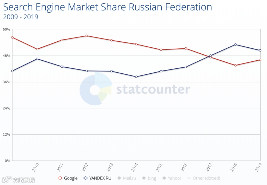 下图来自 StatCounter,显示了 Yandex 的市场份额从 2009 年到 2019 年的发展情况: