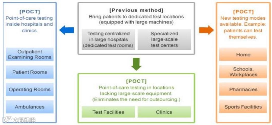 早期POCT以干化学、胶体金、免疫层析等定性技术为主。随着技术进步,免疫荧光、化学发光、微流控等定量技术快速发展并广泛应用于临床,显著提升了检测准确性[1]。目前,POCT已覆盖血糖、妊娠、心血管疾病、感染性疾病、凝血、药物浓度监测等多个领域,应用场景从医院门急诊、ICU延伸至家庭、基层医疗机构、海关及食品环境检测等[1]。