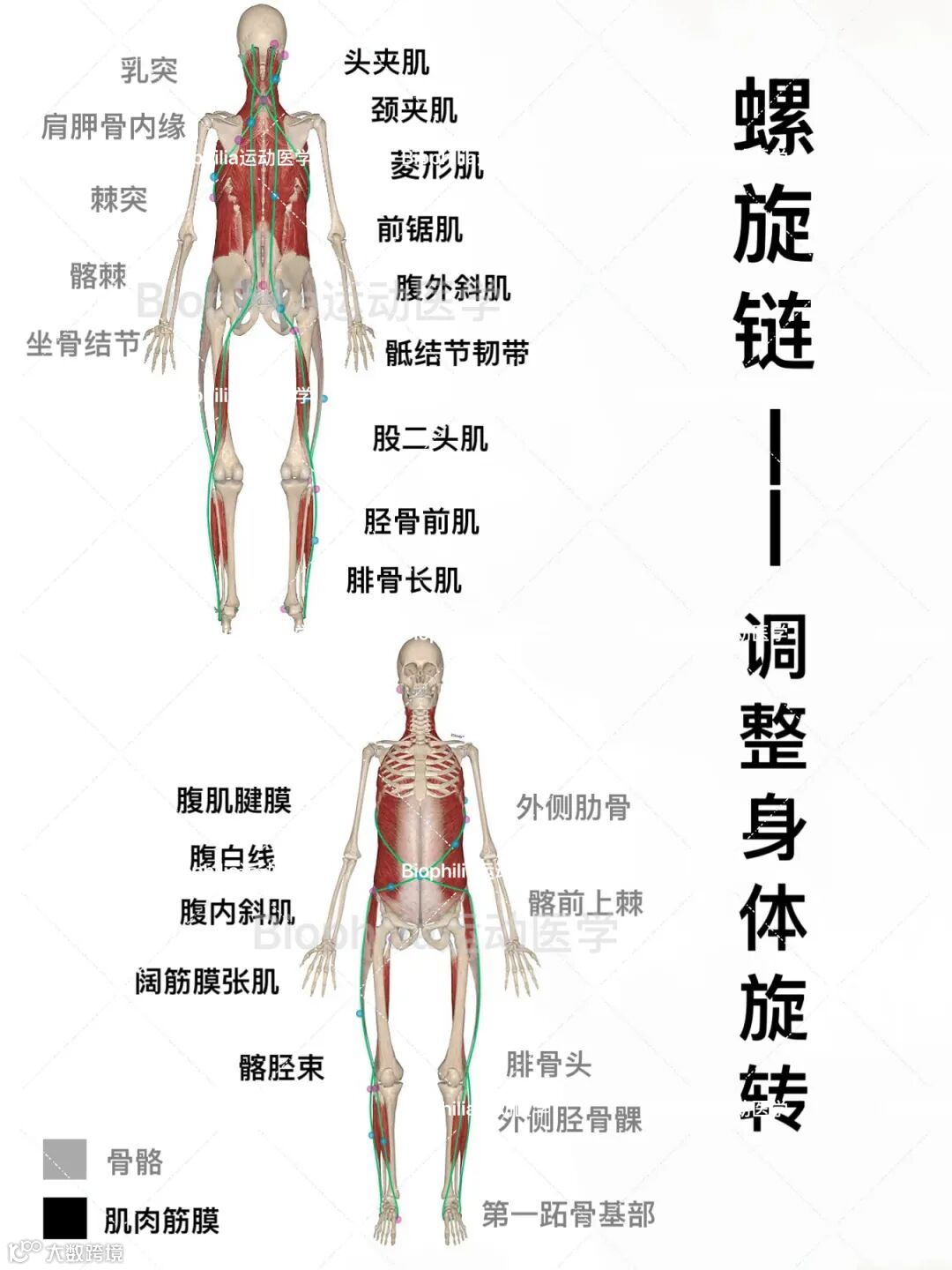 - 临床关联:脊柱侧弯(螺旋链不对称导致脊柱受力不均)、肩肘疼痛(旋转发力时筋膜链代偿性紧张)