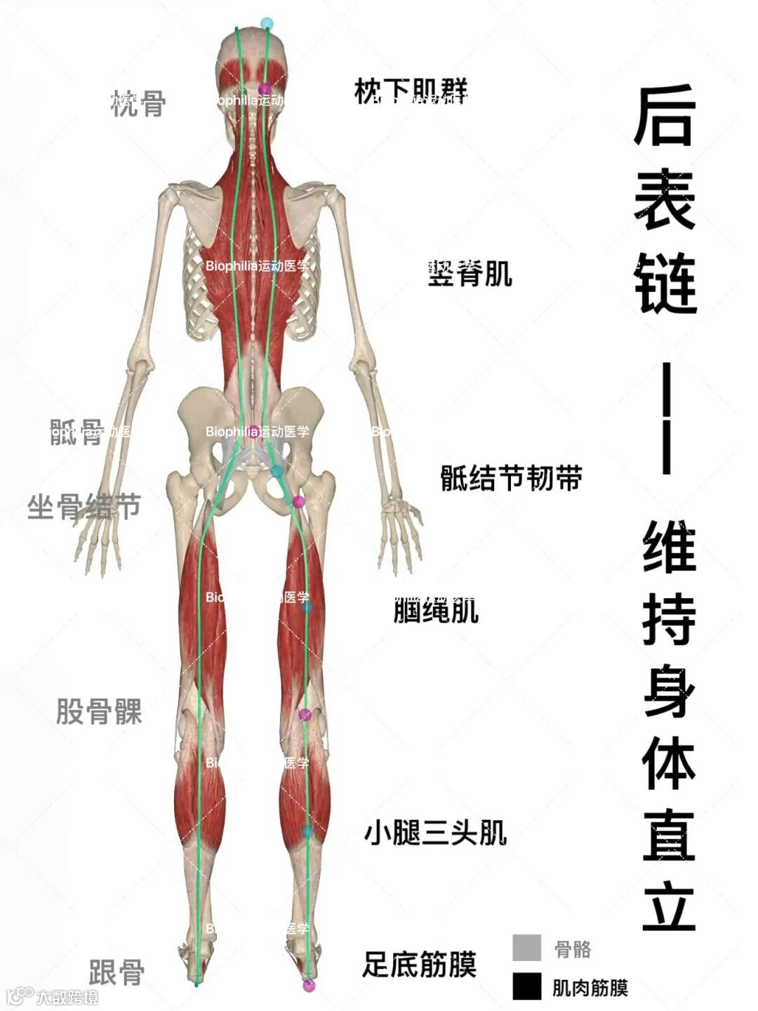 循行路径:足底区域→腓肠肌复合体→腘绳肌群→骶结节韧带→脊柱竖脊肌→颅底肌群(贯穿躯干后侧至头顶)