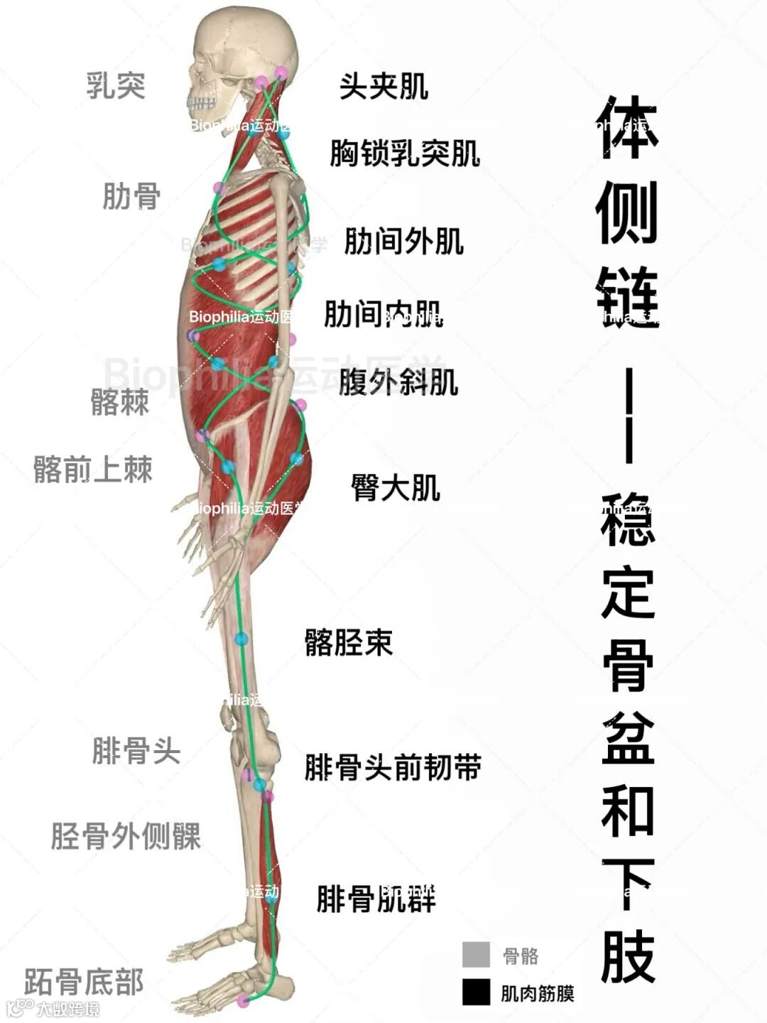组成:从足外侧→腓骨肌群→髂胫束→阔筋膜张肌→肋间外肌(连接下肢外侧至胸廓)