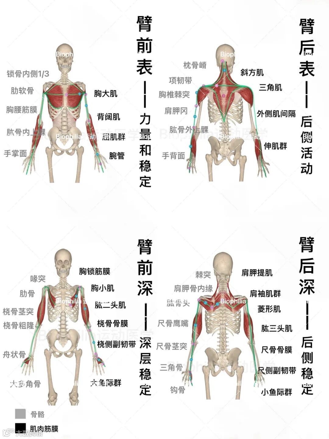 组成:从肩胛骨→上肢(包括肩袖肌群、肱骨周围筋膜、前臂筋膜至手部)的连续纤维网络,连接上肢与躯干核心