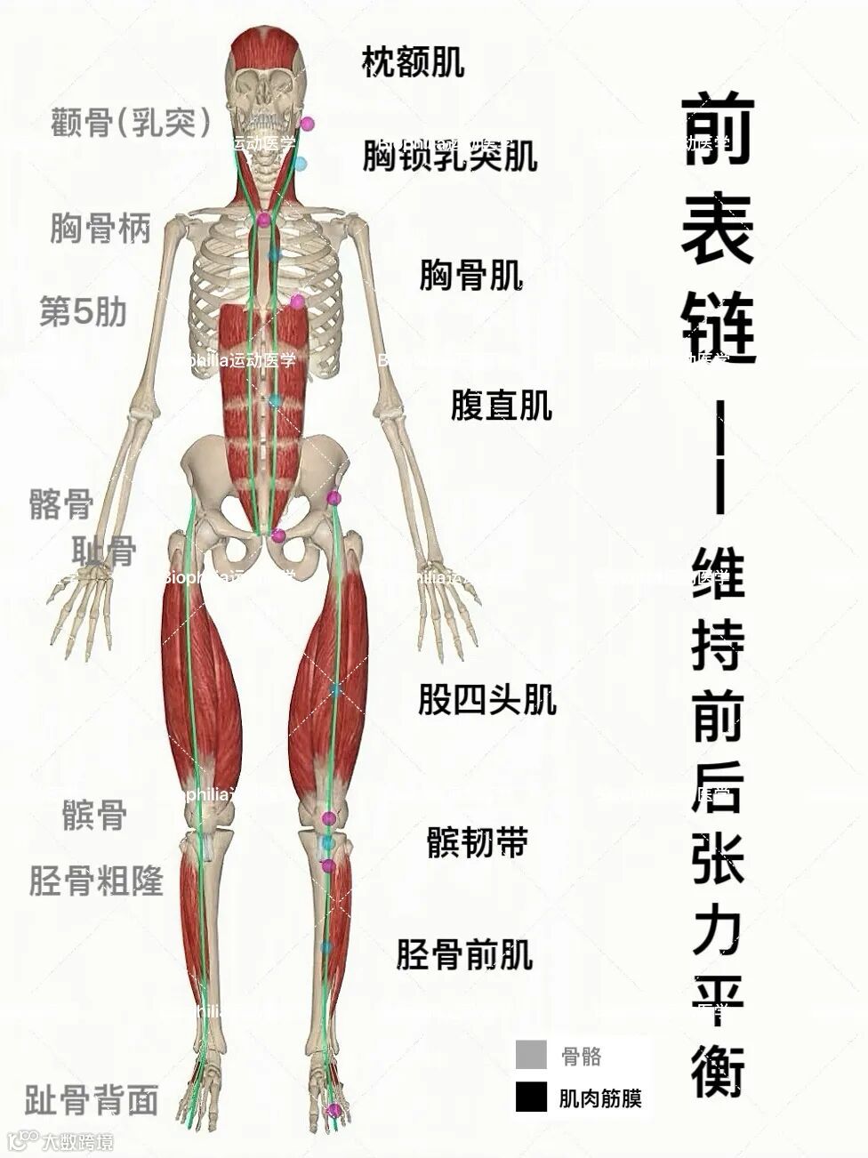 组成:足背部→胫骨前肌群→髌骨韧带→股四头肌→腹直肌系统→胸骨区域→颈前肌群(贯穿身体前侧)