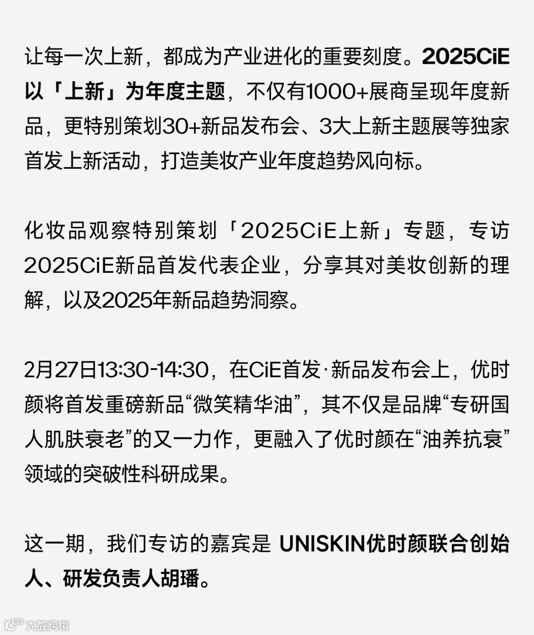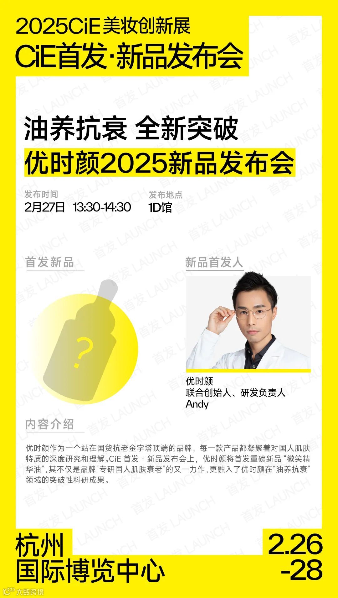 2025CiE美妆创新展将于2.26-28在杭州国博举办。在CiE首发·新品发布会上,优时颜将首发重磅新品“微笑精华油”,其不仅是品牌“专研国人肌肤衰老”的又一力作,更融入了优时颜在“油养抗衰”领域的突破性科研成果。点击链接报名。