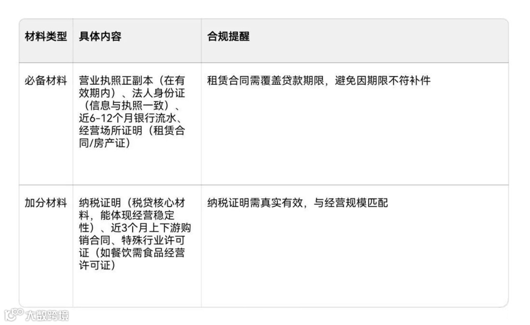 执照状态:需确保无地址异常、年报未报、经营范围与贷款用途不符等情况,可先通过“国家企业信用信息公示系统”自查,有问题先整改再提交申请。