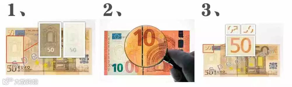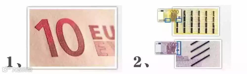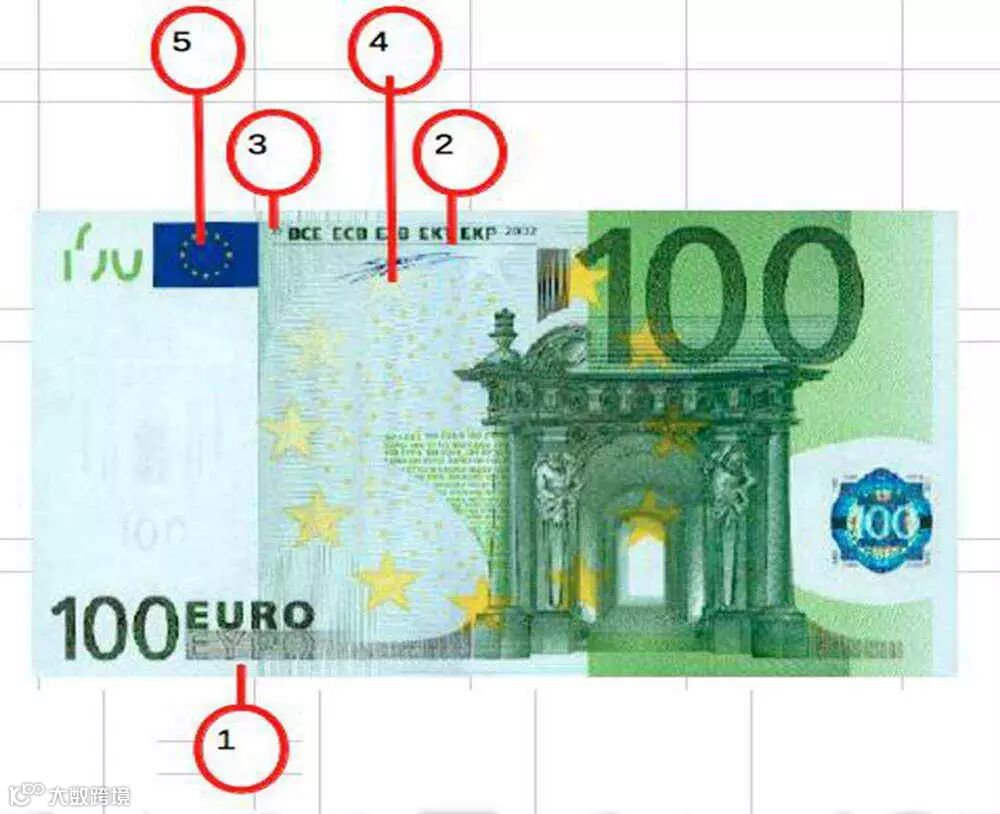 5、Número que cambia de color(号码变色):在面值50、100、200和500欧元的纸币上,背面(正面为带有欧元旗帜的那面)右下角的纸币面值数字符号会呈现深褐色,如果在黄色的灯光下,会呈现带有亮紫且有金属颗粒质感的颜色。