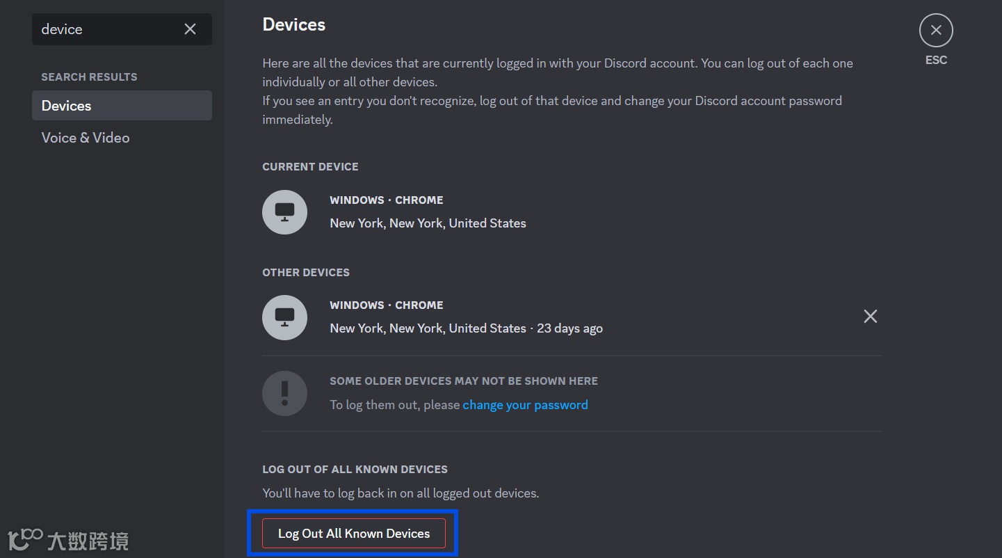 Discord客户端——设置settings——设备devices——从所有已知设备上退出log out all known devices。可以启用两步验证,电话号码和backup codes,如果忘记密码,这可以辅助重新登录。最后在移动端设备上卸载重装Discord。