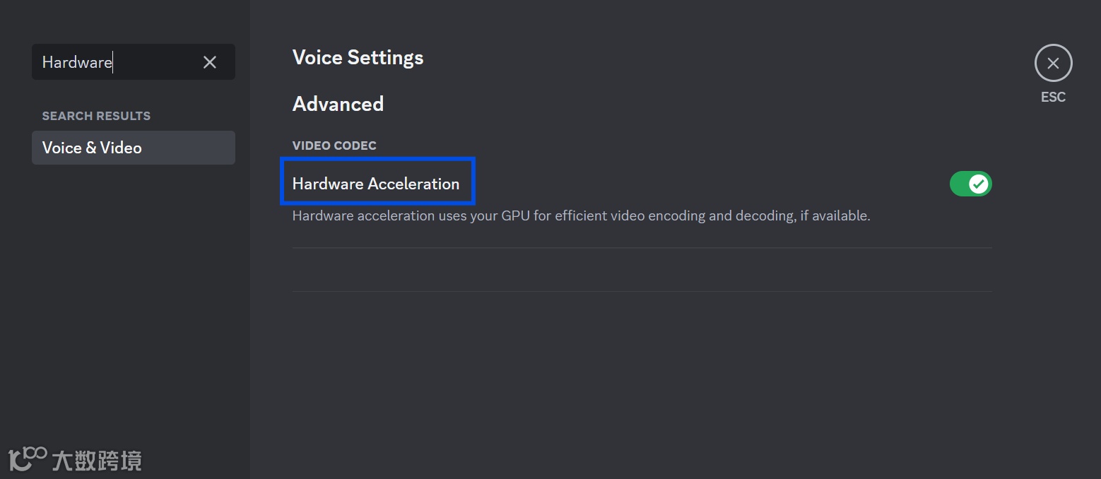打开Discord——用户设置User Settings——找到硬件加速Hardware Acceleration。如果开启了此项,先关闭再重启Discord。