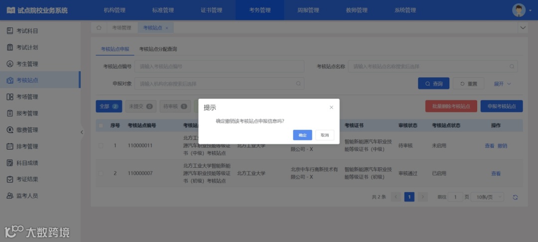 对于已提交且培训评价组织未审核的考核站点,可以进行撤销考核站点操作。