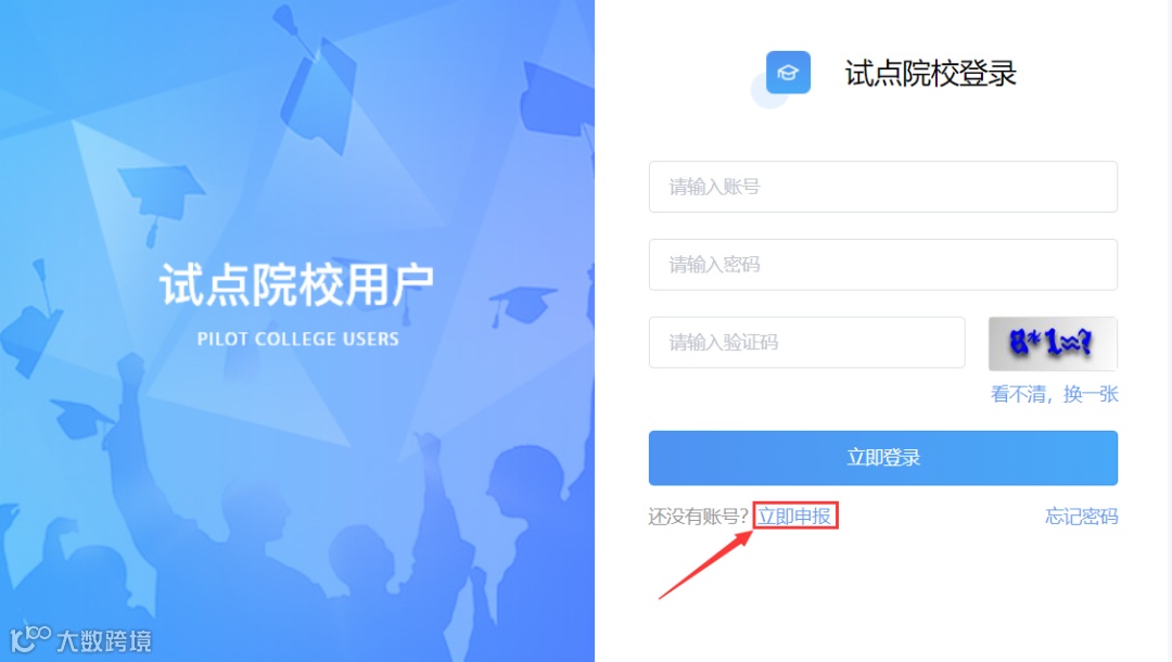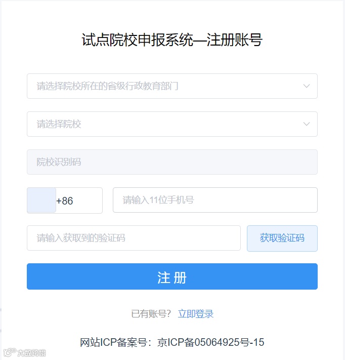 登录试点院校业务平台,点击【试点院校业务平台】进入试点院校登录页面,左下方点击“立即申报” 按钮,注册试点院校账号。