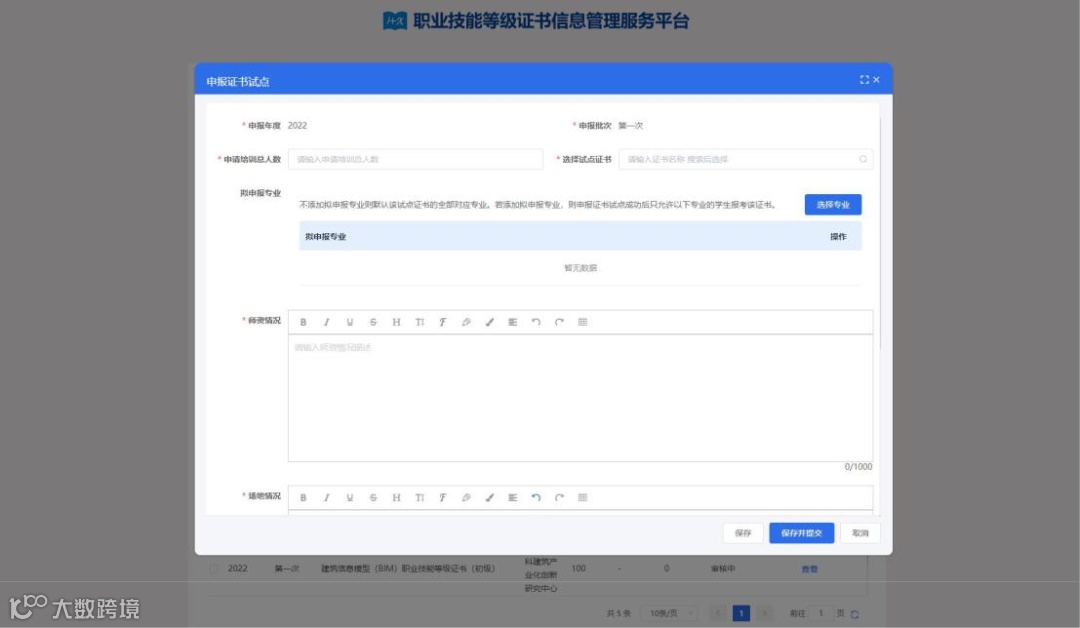填写师资情况、场地情况等信息后,点击“保存”按钮,暂存填写的申报信息;点击“保存并提交”按钮,提交申报信息等待审核即可。