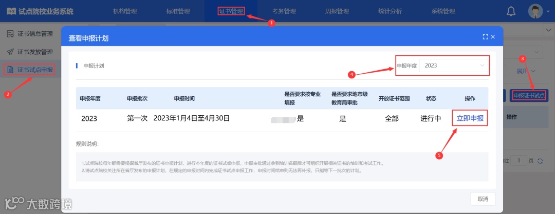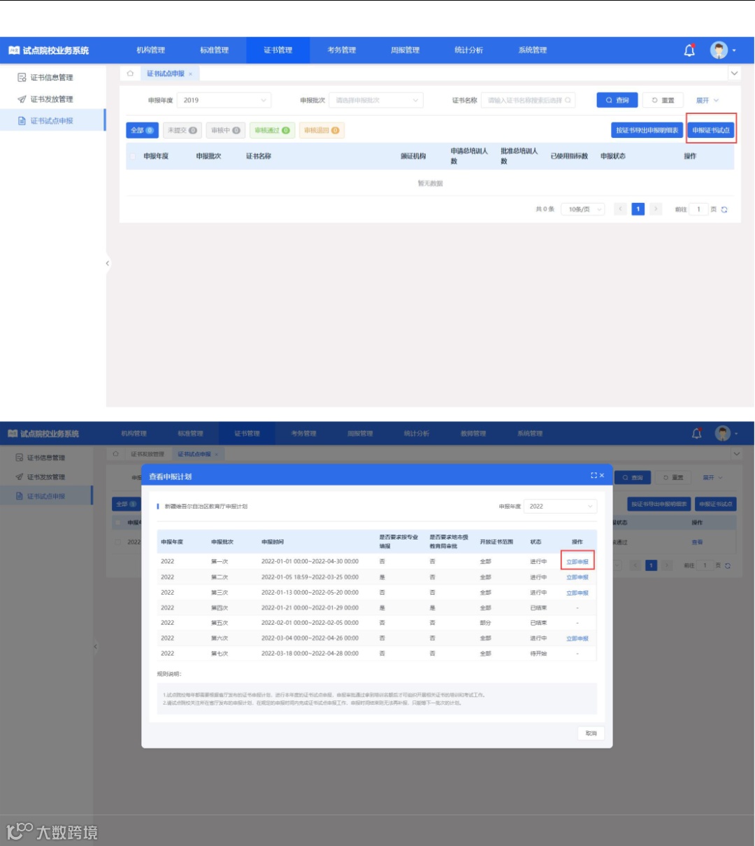 在【证书管理-证书试点申报】页面,点击“申报证书试点”按钮,查看省厅发布的证书申报计划信息。当申报计划处于“进行中”状态时,点击“立即申报”按钮,进入申报证书试点表单填写页面。