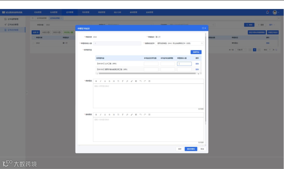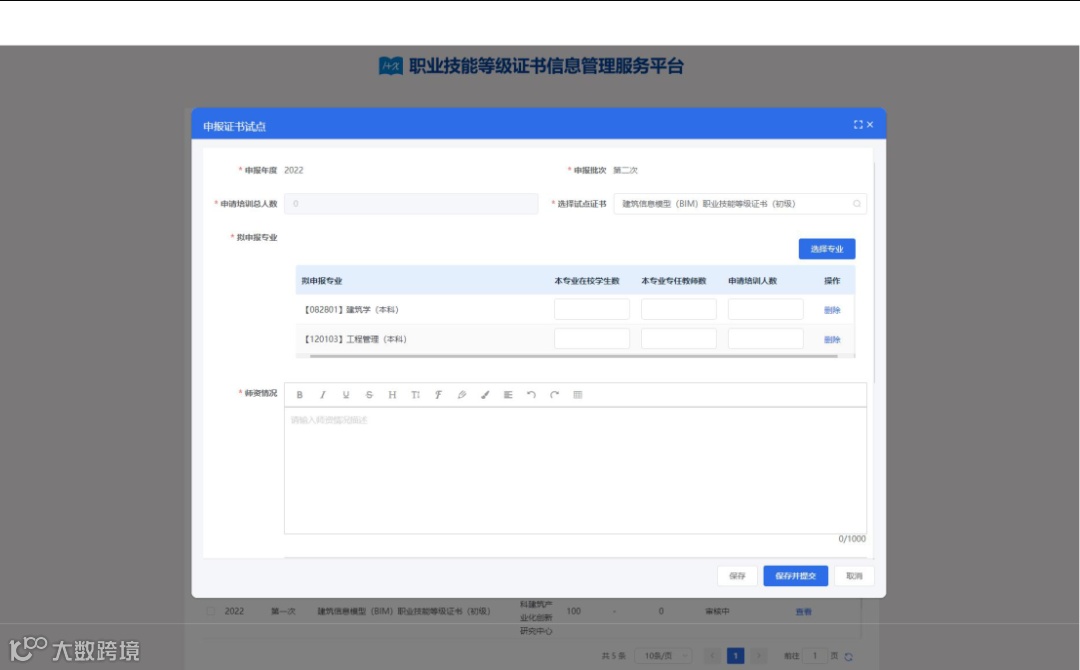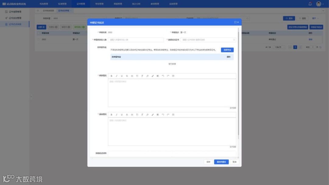注意:若添加专业,则在考务报考中只有该专业的考生才能报考。若不添加专业,则申报的该证书对应的所有专业的考生均能报考。
