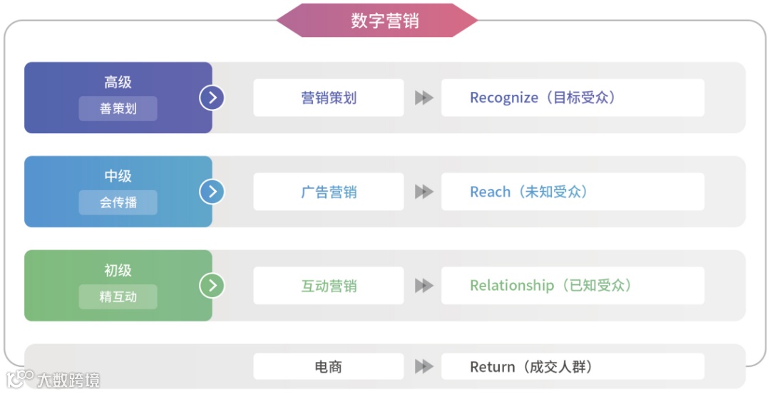 数字营销是以“技术+数据”为双驱动,对传统营销进行互联网化、数据化和智能化改造,进而帮助企业构建消费者全渠道信息触达,实现精准互动和交易的过程。其本质是借助数据、技术及营销资源,依靠实时数据跟踪,实现营销由粗放向集约发展,促进企业更好地营销,更好地发展。