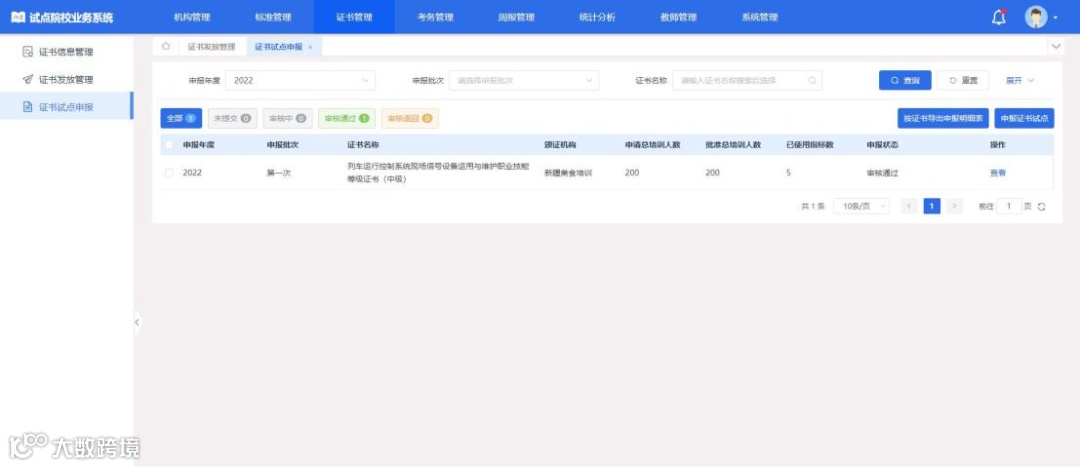 证书试点申报提交之后,需等待主管教育行政部门等审核,期间可登录系统查看审核状态及审核结果。