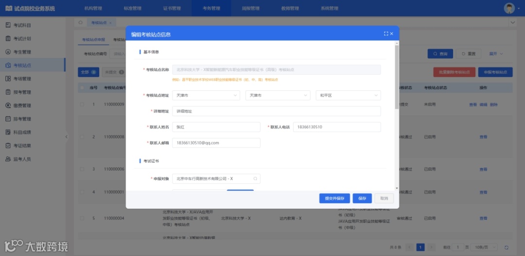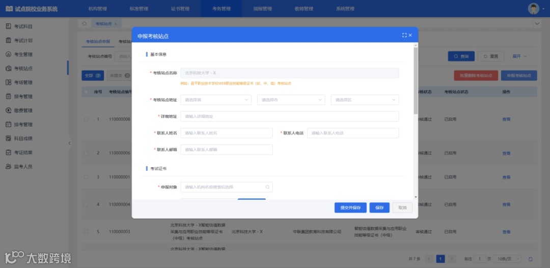 其中“考核站点名称”无需填写,将根据院校名称+考核证书的展示方式自动生成。