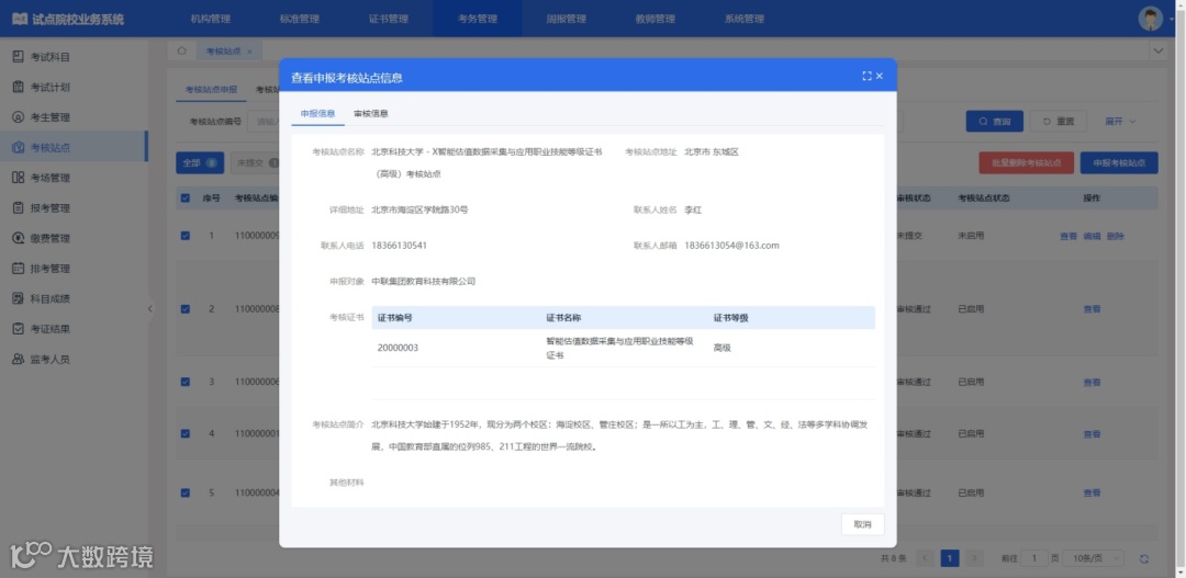 查看考点信息通过点击列表右侧“查看”按钮查看考核站点详细信息。