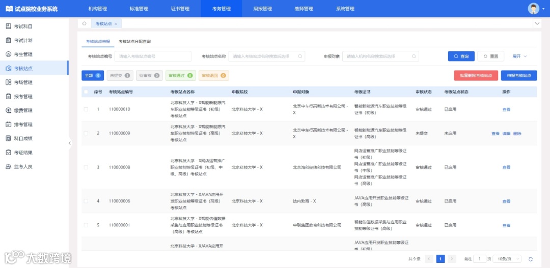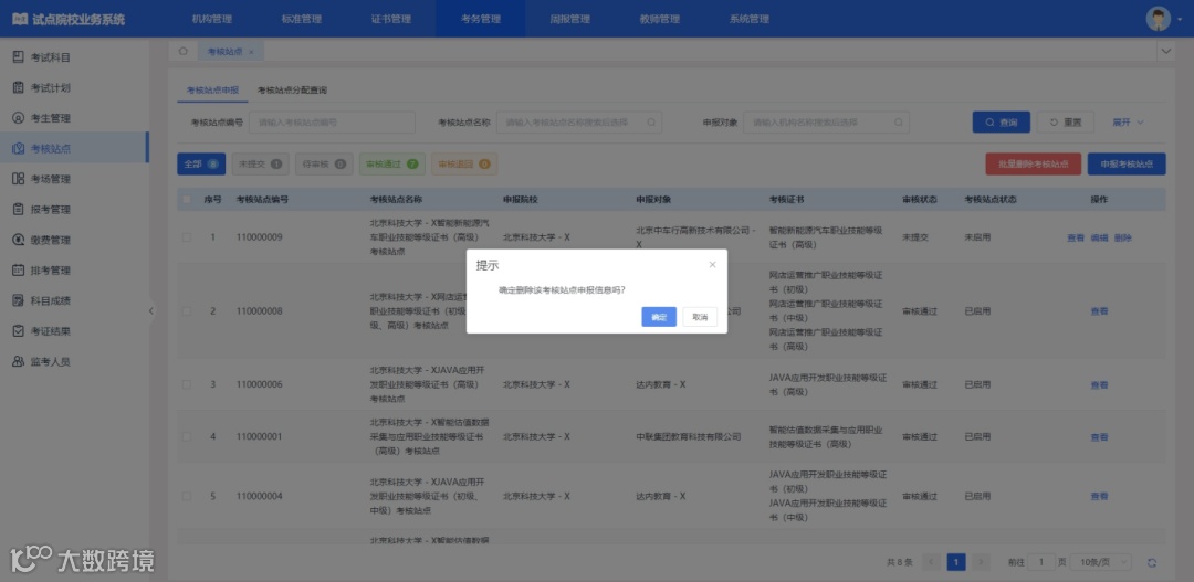 对于未提交、审核退回的考核站点,点击右侧“删除”按钮删除该条数据或点击“批量删除考核站点” 删除多条数据。