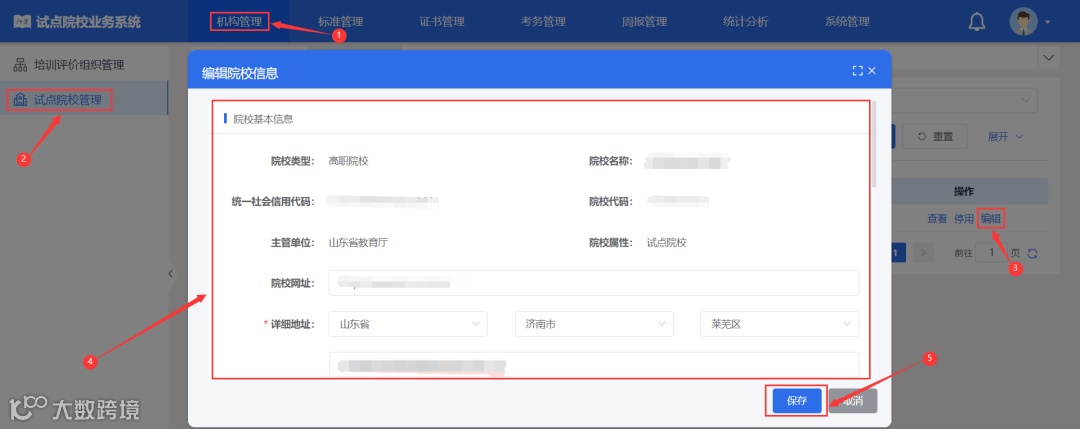 按照提示完善系统中院校基本信息,全部填写完成后点击“保存”即可。