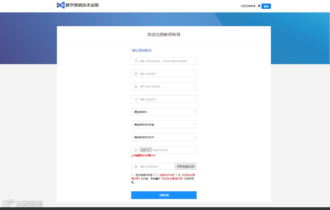 打开1+X数字营销技术应用云课程网站,点击右上角“登录”,登录教师账户。没有账号的老师可点击“注册教师账号”完成账号申请。登录教师账号后,可进行“班级创建”“批量导入学生”“开课申请”等操作(学生的登录账户和密码由教师创建)。